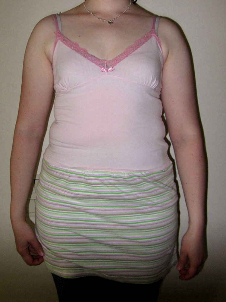 Tässä kuvassa ei ole sivusaumoja vielä ommeltu, mutta hyvin näkee poikkisauman olevan liian matalalla. Haastetta jatkomuokkauksiin aiheutti se, että kangasta oli hyvin niukasti. Purin vaakasauman, leikkasin yläkappaleen alareunasta n. 5 cm pois ja lisäsin vyötärölle helmaa pidentämään jämäkankaista leikatut kaitaleet.